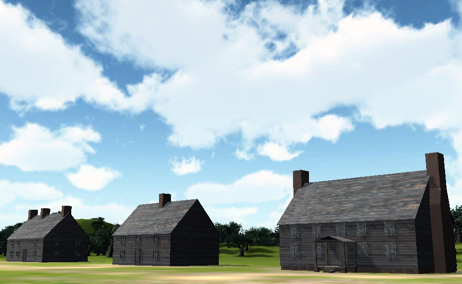 This virtual world environment is available online. Instead of my traditional lecture showing images of the various house forms, I projected the virtual world environment and explored it with the class. I asked the class about each house and students responded with date ranges, geographic areas, and various other points.